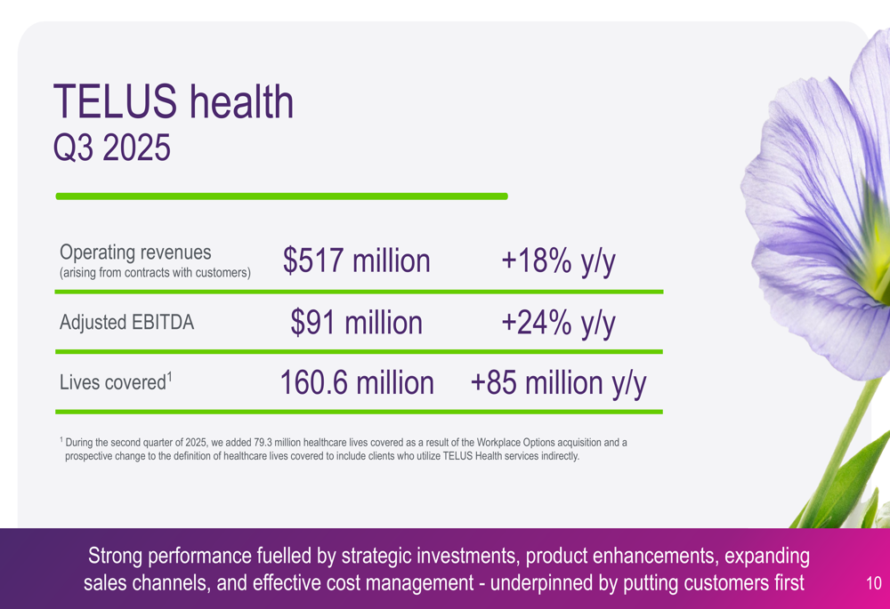 TELUS Health emerged as a standout performer with operating revenues increasing 18% year-over-year to $517 million and adjusted EBITDA growing 24% to $91 million. The segment now covers 160.6 million lives globally, an increase of 85 million compared to the previous year, largely due to the Workplace Options acquisition which added 79.3 million healthcare lives.