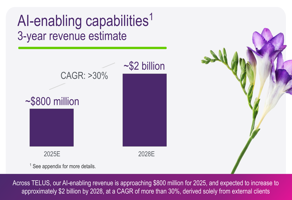 TELUS is increasingly positioning itself as a leader in AI-powered solutions, projecting its AI-enabling capabilities revenue to grow from approximately $800 million in 2025 to $2 billion by 2028, representing a compound annual growth rate exceeding 30%.