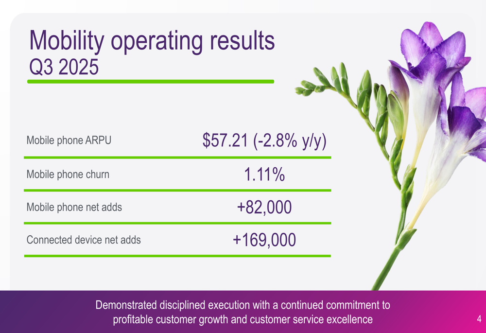 Mobile segment performance showed resilience with 82,000 mobile phone net additions and 169,000 connected device net additions. However, mobile phone ARPU (average revenue per user) declined 2.8% year-over-year to $57.21, indicating continued pricing pressure in the competitive Canadian wireless market.