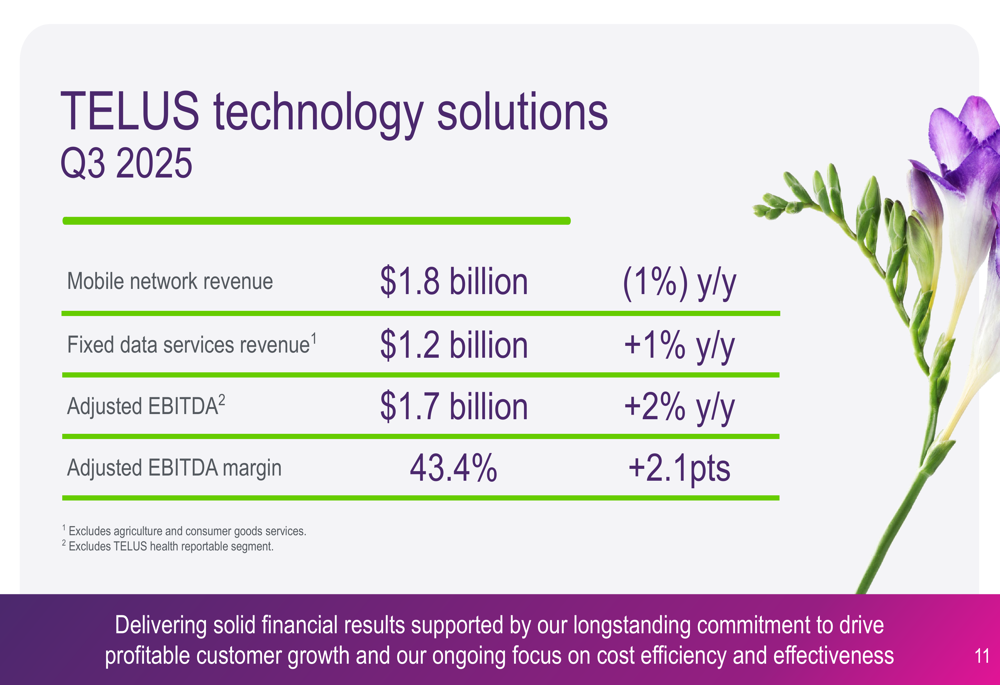 TELUS Technology Solutions (TTech) showed modest growth with mobile network revenue up 1% year-over-year to $1.8 billion and fixed data services revenue increasing 1% to $1.2 billion. The segment’s adjusted EBITDA grew 2% to $1.7 billion, with margin expansion of 2.1 percentage points to 43.4%.