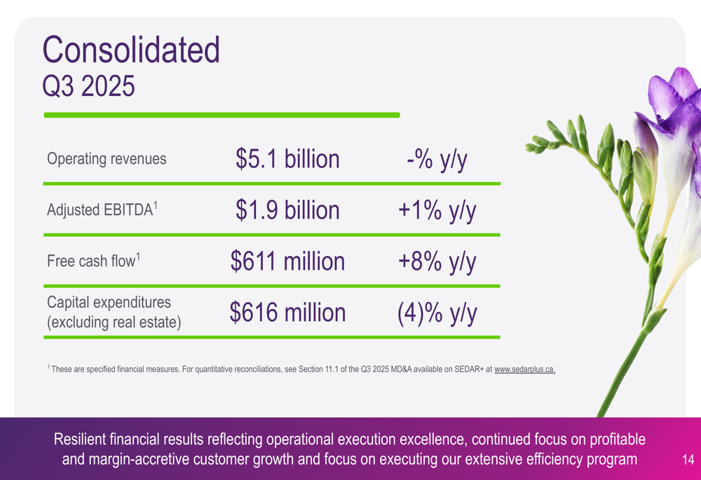 On a consolidated basis, TELUS reported flat operating revenues of $5.1 billion, while adjusted EBITDA increased 1% to $1.9 billion. Free cash flow grew 8% year-over-year to $611 million, and capital expenditures decreased 4% to $616 million.